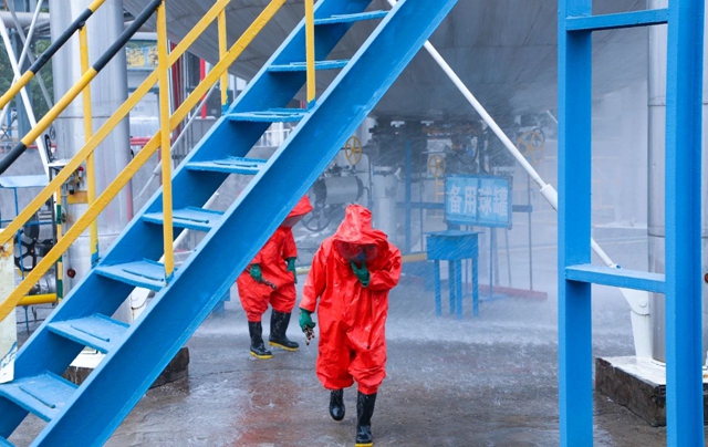 随后,现场警报声响起,泄漏区域被警戒线隔离,抢险组成员佩戴面具,将消防通道栏杆拆除,协助现场进行电动消防炮喷淋,监控消防水压。消防车及各应急小组也随即赶到“事故”地点,中毒人员被抬至安全地带后,救护人员立即展开急救。消防队员迅速下车,铺设消防水带、连接消防栓、打开消防阀,动作敏捷,一气呵成。与此同时,三名组员穿防化服、戴空气呼吸器有序进行堵漏。