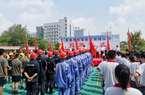 6月4日上午,孝感市举行社会应急救援队伍授旗仪式,双环公司总经理鲁强带领公司应急救援队队员参加仪式。