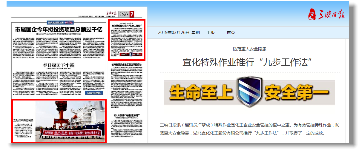 2019年,集团大力推行特殊作业“九步工作法”,取得了实实在在的成效,安全生产稳定可控。3月26日,三峡日报A7经济版面以《防范重大安全隐患——宜化特殊作业推行“九步工作法”》为题报道了宜化集团抓好安全生产的典型做法,体现了宜化坚决打赢安全生产攻坚战的信心与决心。