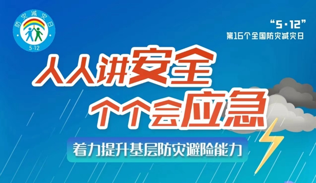 5月12日是第16个全国防灾减灾日,5月11日至17日为防灾减灾宣传周,今年全国防灾减灾主题为“人人讲安全,个个会应急——着力提升基层防灾避险能力”。