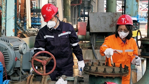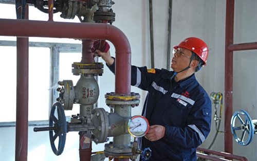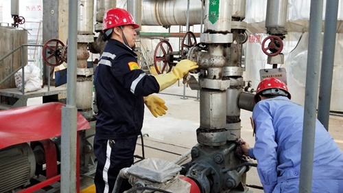 ▲卞平官到新疆宜化热电分厂燃油泵房擦拭设备