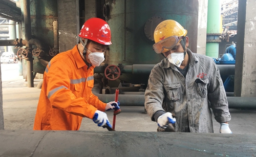 ▲彭向华到楚星公司硫酸分厂擦拭设备