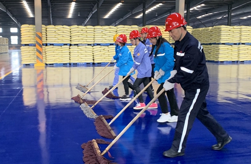 ▲周金平到松滋肥业磷铵分厂袋库清理地面