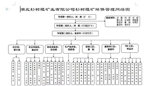 杉树垭矿结合实际,严格制定环保工作责任书,理顺管理组织体系,明确职责分工,责任到人,各责任人上下一心、协调联动,形成了绿色环保矿山建设工作合力。严格实行分级管理,按矿级、区队级、班组级三级进行管控,各级环保专员全面督导对应区域内环保工作,管控全覆盖,不掉项,不漏点。