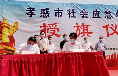 仪式上,孝感市应急管理局与双环公司签订框架合作协议,双环公司应急救援队被授予“孝感市危险化学品应急救援队”旗帜。