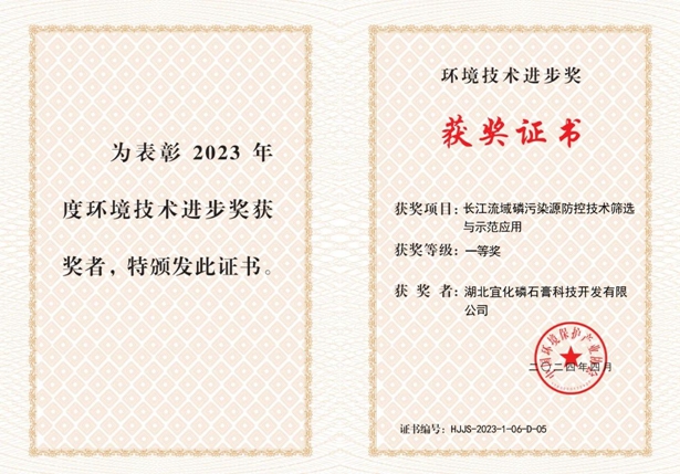 磷石膏科技公司一项目获评2023年度环境技术进步奖一等奖